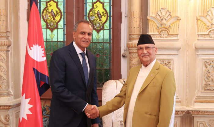 नेपाल भ्रमण क्रममा अमेरिकाका व्यवस्थापन तथा स्रोत सम्बन्धी उपविदेशमन्त्री रिचार्ड आर बर्माले प्रधानमन्त्री केपी शर्मा ओलीलाई सिंहदरबारमा शुक्रबार दिउँसो भेट्दै बधाई ज्ञापन गरेका हुन् ।