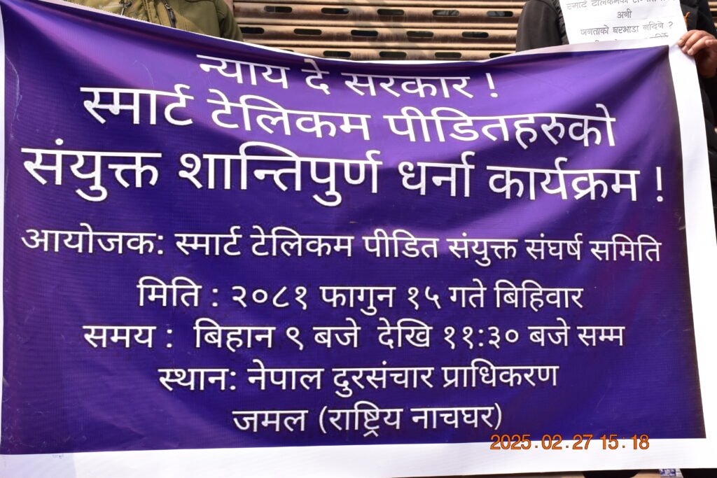 बिहीबार, आज काठमाडौंको जमलस्थित प्राधिकरणको कार्यालय अगाडि स्मार्ट टेलिकमको सम्पत्ति सरकारले लाइसेन्स खारेजी गरेपनि घरभाडा, बिजुली, कर्मचारी र रिचार्जकार्ड बिक्रेताहरुको भुक्तानी नगरेको भन्दै धर्ना दिएको हुन् ।